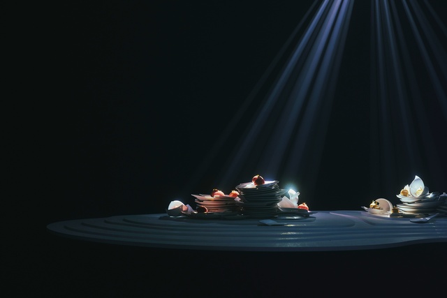 Stranded on a projection-mapped island sat a stack of sinking plates: not tectonic plates but broken plates. Whether or not Kavali and Creature Post’s performative Porcelain explicitly commented on coastal inundation or food insecurity, it was hard to ignore these facts when, beneath the floorboards, the Waitematā’s coastline shifts. The urban littoral became literal when, with some hesitation, we plundered its last resources of delicate canapés. Ooh, you know what, I think I’ll try the choux (pronounced “shoo”)1. Though audience participation climaxed in Flux, a vat of real-time, motion-tracking molten muddled by you and me playing both spectator and spectated. Trace Element and Holden’s seductive honey-pot surveillance system was offset by the silliness of swimming through a sea of precious minerals (especially post-pillaging an isle).