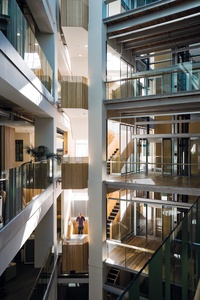 The design solution cut into the concrete structure to create two full-height atria, producing a supremely good work environment with desking arranged alongside glazed balustrades. The atria also create the ‘lungs’ that allow the building to breathe with natural ventilation, drawing fresh air in from the rooftop garden, and exhaling it out through the new double-skin façades. It addressed all of the environmental categories that would find their way into the first release of Green Star NZ in 2007, from transport and ecology through to energy, water and materials. Ultimately, it was a shared commitment to designing responsibly for the future — more than any rating tool or calculator — that aligned the team around a common goal.