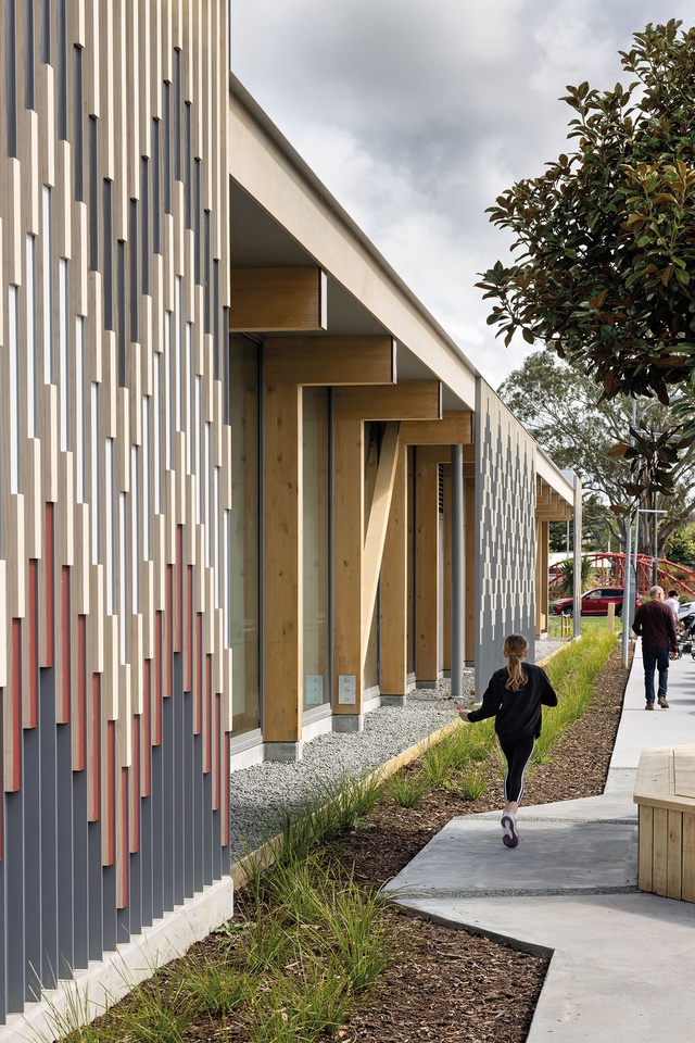 The design of Pātaka was intentionally ‘regional’, responding specifically to its location, community and people. Materials are robust and simple — exposed timber joists, concrete floors and plywood. Red louvres along the north elevation are configured into a basketweave patterned screen — a strong iconic form recognisable across the city, representing the weaving together of both the community and the building’s many facilities. In these earlier years of the practice, cultural design expressions like this tended to originate from intuition and the happy coincidence of like-minded clients.