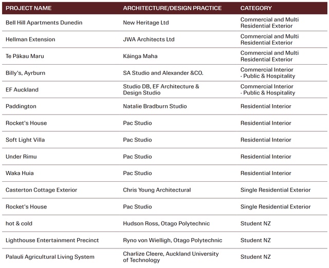 A highlight this year according to the judges has been the Residential Exterior category, where palettes demonstrate a strong sense of context — from the reddish autumnal tones of rural New Zealand to the grey greens and cool blues of coastal Australia.