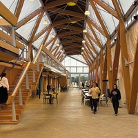 Reorienting Porirua’s urban edge and drawing it back towards Te Awarua-o-Porirua foreshore, this adaptive reuse project features a dramatic glulam structure that directs visitors towards the harbour. Its taniwha-inspired form creates a continuous urban pedestrian spine, which links the foreshore with the city’s cultural heart — Pātaka — and is animated by a 60-metre-long Michel Tuffery mural. By reusing the concrete and steel frame of a former retail and industrial shed, the project transforms the prosaic structure into a high-performing, lively, and diverse food and market hall (kai tahi means ‘food for sharing’) with an integrated crèche. See Architecture NZ May/June 2025.