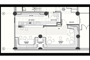 Despite its small size, Quinn Bar was meticulously planned for functionality, from Complete Construction’s renovations to the client’s operation strategy. Partition walls that separated the storage space and corridor were removed, the bathrooms were strategically relocated, and the kitchen was scaled back to remove large and unnecessary commercial kitchenware. These changes allowed the venue to maintain the maximum footspace for the bar and lounge. The streamlined back-of-house — made possible by the venue offering light food and the option of ordering food from elsewhere — allows the staff to operate efficiently in tight quarters without sacrificing the guest experience.