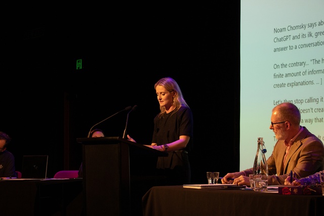But are we not regularly faced with garbage? “Our skyline is monument to economics and ego, our suburbs consume fertile farmland like a malevolent biohazard, we’ve designed motorways as though cars are sacred and yet the traffic fails to flow.” Lindley Naismith (architect, NZIA fellow, industry legend) drove home Quirk’s position: we’ve done it for so long and screwed it up, perhaps the computer might do a better job? “We have let profit masquerade as planning,” she said to raucous applause. “AI is immune to egos: it doesn’t get the old boy’s network, it cannot be seduced by campaign donations.” Naismith enamoured us with visions of a fairer city, designed not by the public-private profiteer (possible not by a person at all), one where we all live in warm, dry, dense homes well-connected by reliable transport in a compact city filled with clean air, clear water and clean streets: “he tangata, he tangata, he tangata.” A city of fails turned back into a city of sails by the glorious algorithm — and I have to say that for an inkling of a moment, she nearly had me over to her side!