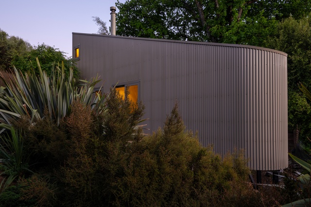Openings are thoughtfully placed to frame views, and skylights bring an abundance of natural light into the space while maintaining privacy. Interior timber brings warmth, a sense of comfort, and resilience, where the exterior curved forms are echoed inside, enriching the experience of the building’s form. A bunkroom loft, accessed by ladder, utilises the generous double-height space, extending the home’s capacity in a charming manner.”