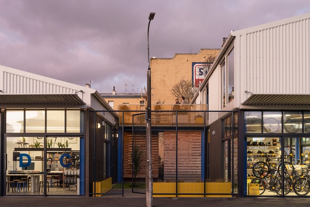 Located on a corner site, the ground-floor tenancies feature wrap-around shopfronts and awnings that activate both streets. A planted courtyard enhances the street, serving as a forecourt and backdrop for the first-floor apartment and providing outdoor space for the tenancies.