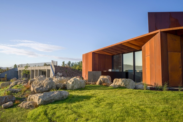 A corrugated roof recalls the region’s vernacular structures, while sculpted earth mounds both cradle and protect the house, settling it firmly into the foothills.